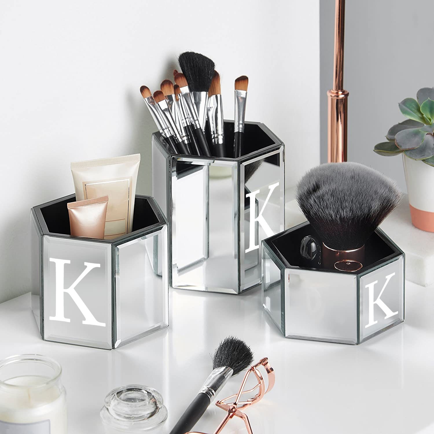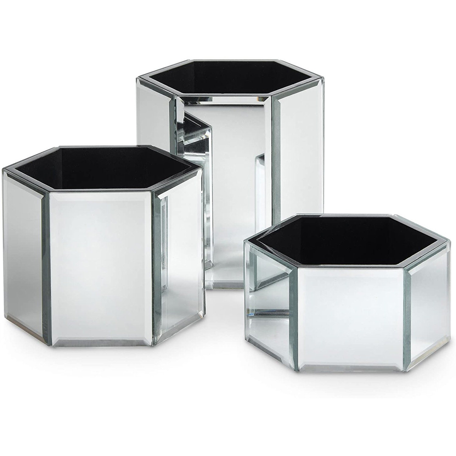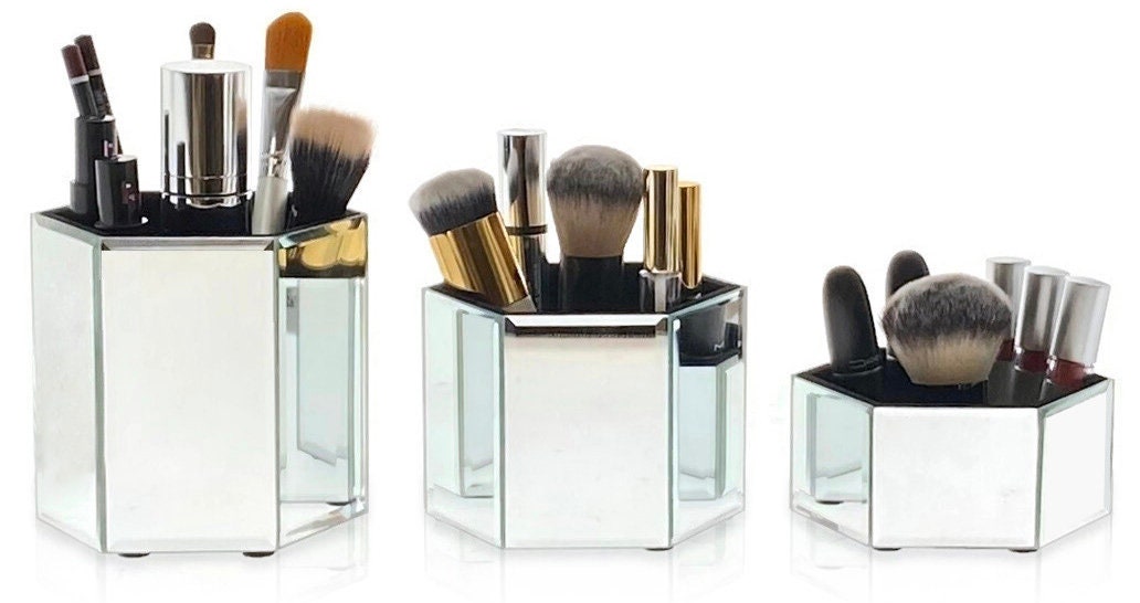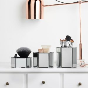 Set of 3! Honeycomb Mirrored Glass Cosmetic/Makeup Organizer Tray Set, comprising three hexagon-shaped trays designed to elegantly store your makeup/cosmetics, jewelry, and brushes.